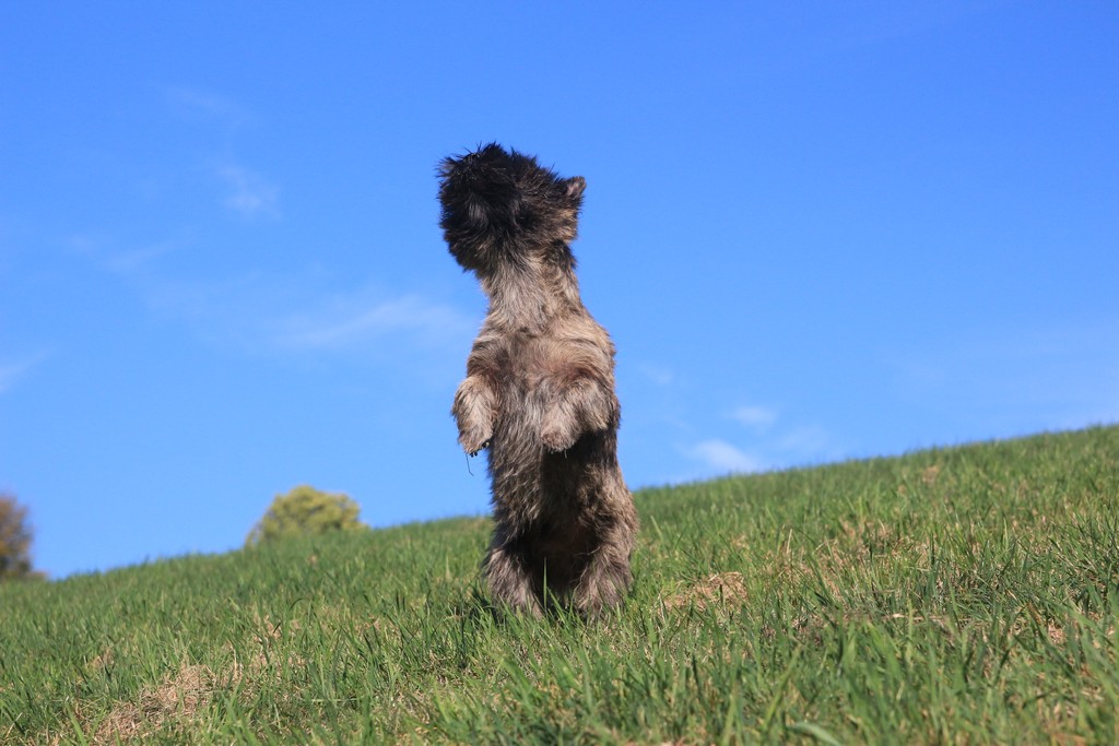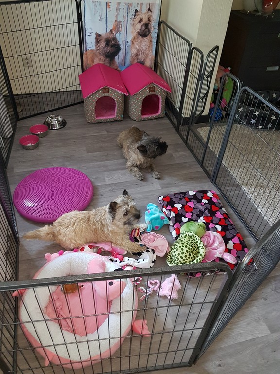 Een volwassen Cairn Terrier heeft dagelijks beweging nodig. Krijgt hij voldoende beweging dan zal hij in huis rustig zijn. U kunt die beweging op diverse manieren geven, door wandelingen te maken, maar ook door hem in park of bos te laten spelen met andere honden of ballen. Ze kunnen ook uitstekend mee met fietsen of hardlopen, mits u afstand en tempo aanpast aan de hond en langzaam opbouwt. Wij wonen landelijk waardoor bij ons de pups al vanaf het begin kennis maken met weilanden, bossen, water, etc. etc. U moet bij een pup niet overdrijven met de beweging, houd er rekening mee dat een pup niet zelf aangeeft als het teveel is. Als u de pup net heeft, dan is 5 minuten aan het lijntje lopen per keer voldoende. Daarna kunt u de beweging met 5 minuten per maand opbouwen. Daarnaast kan de pup natuurlijk wel volop in huis of tuin spelen.