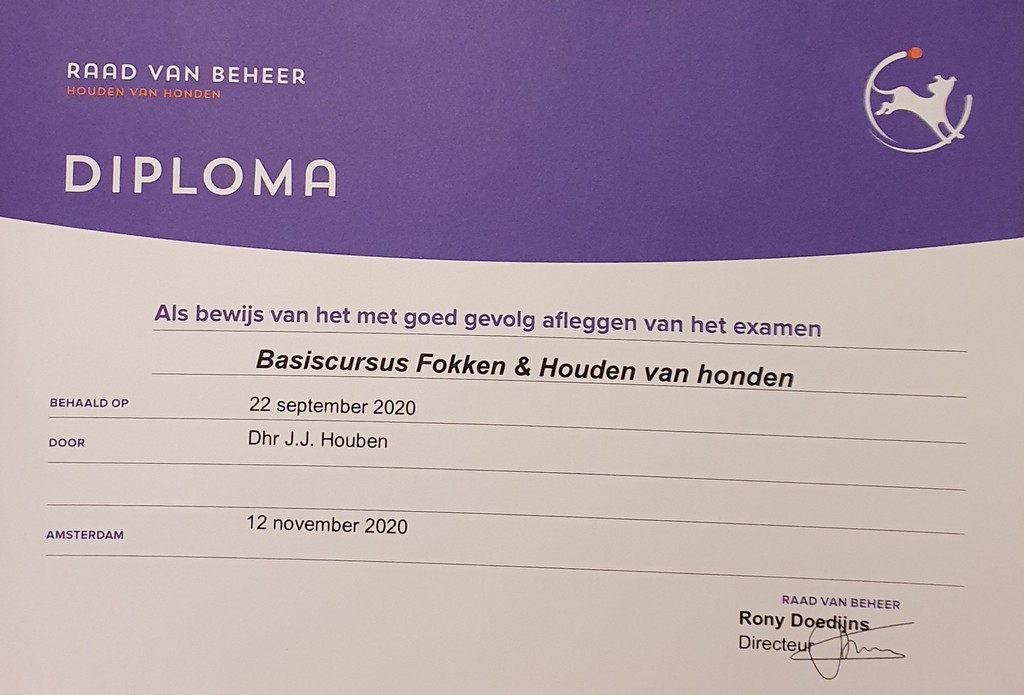 Jack Houben heeft de cursus "Fokken en houden van Honden" (voorheen KK1) gevolgd via MHSV (Maastrichtse HondenSport Vereniging). De cursus startte in september 2019, liep vertraging op door COVID-19 maar werd uiteindelijk afgesloten met het examen op 22 september 2020.